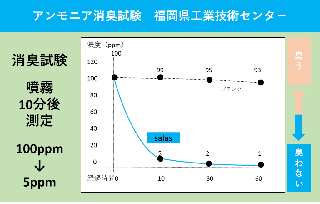 福岡県工業技術センタ-における消臭試験では、表のとおり高い消臭力が実証されています。